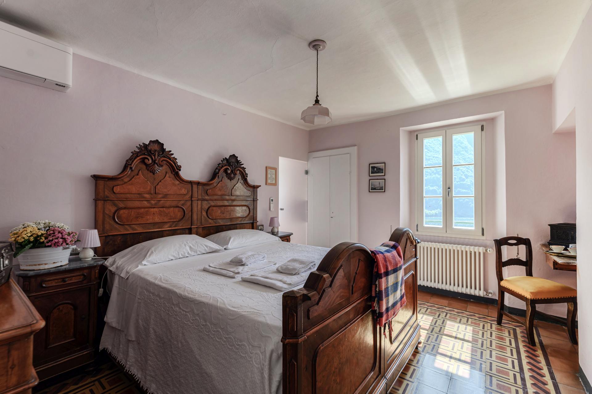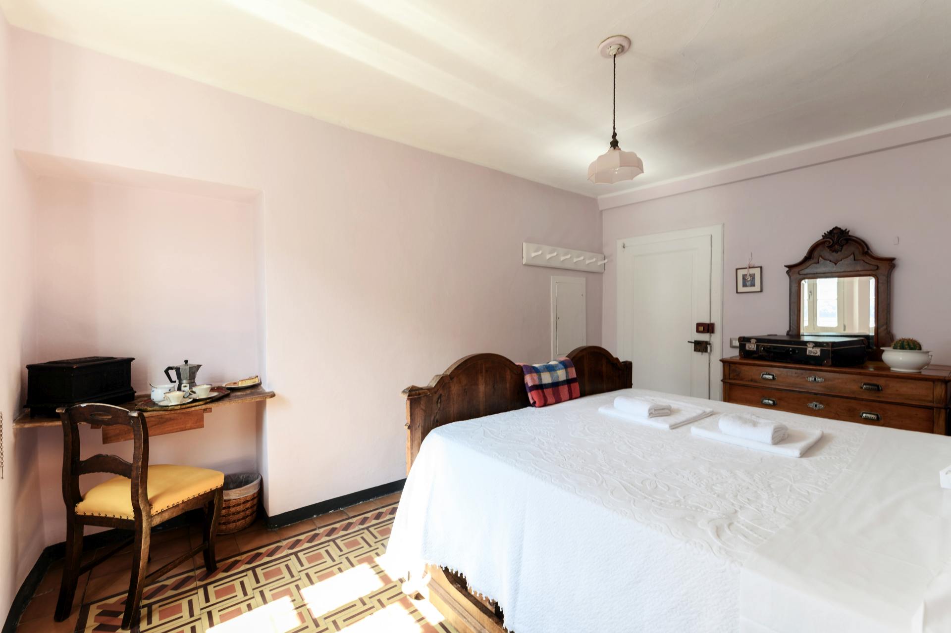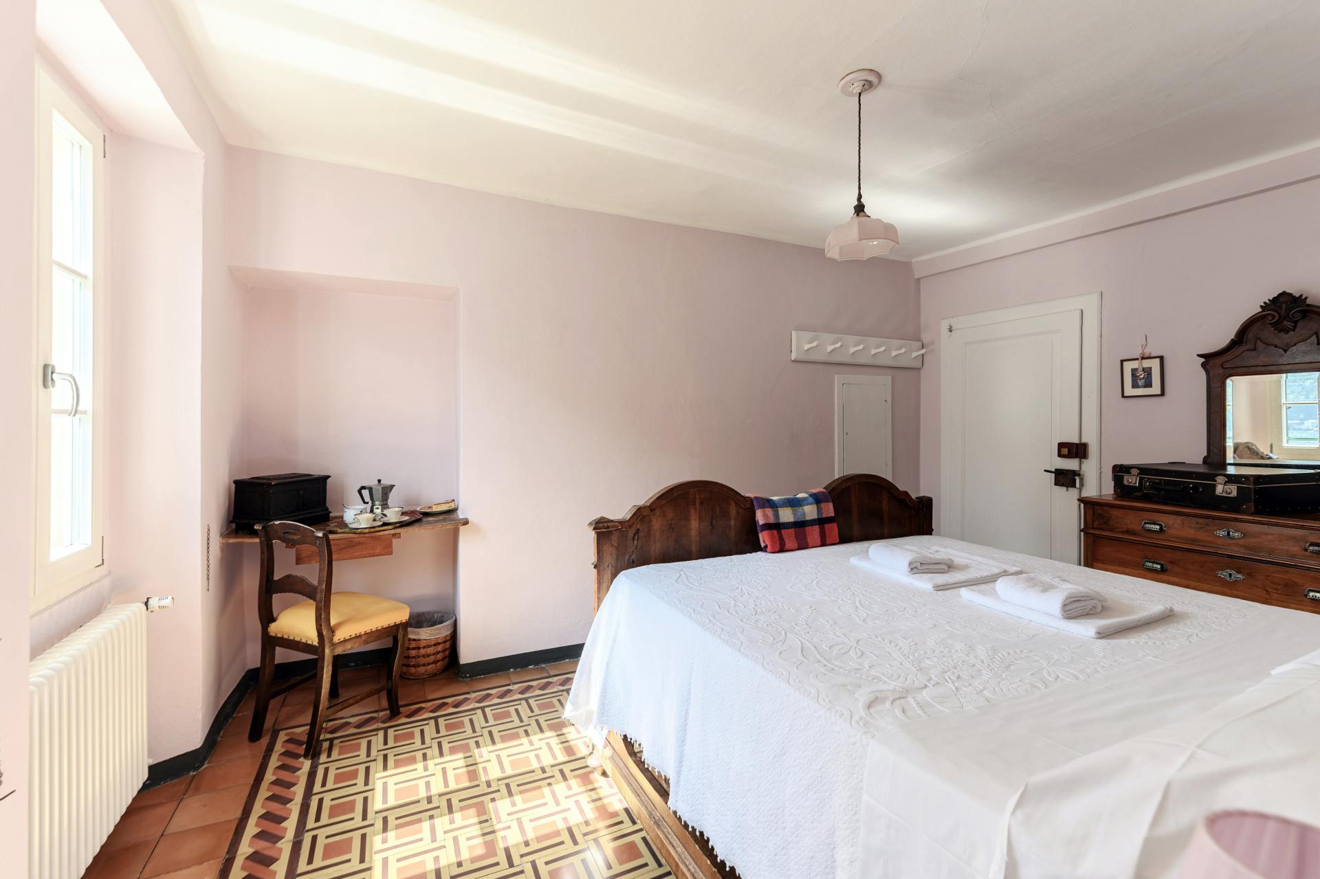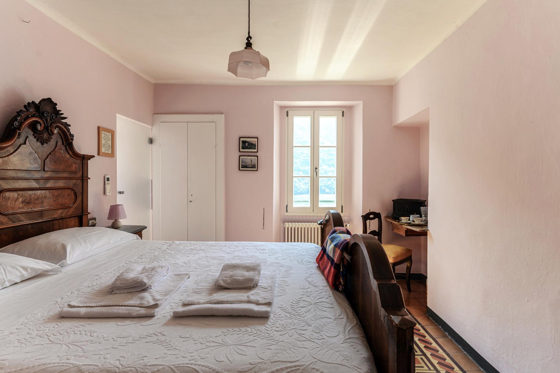 The pastel pink colors, the old wooden bed and the original tiled floor… a little gem overlooking the lake.