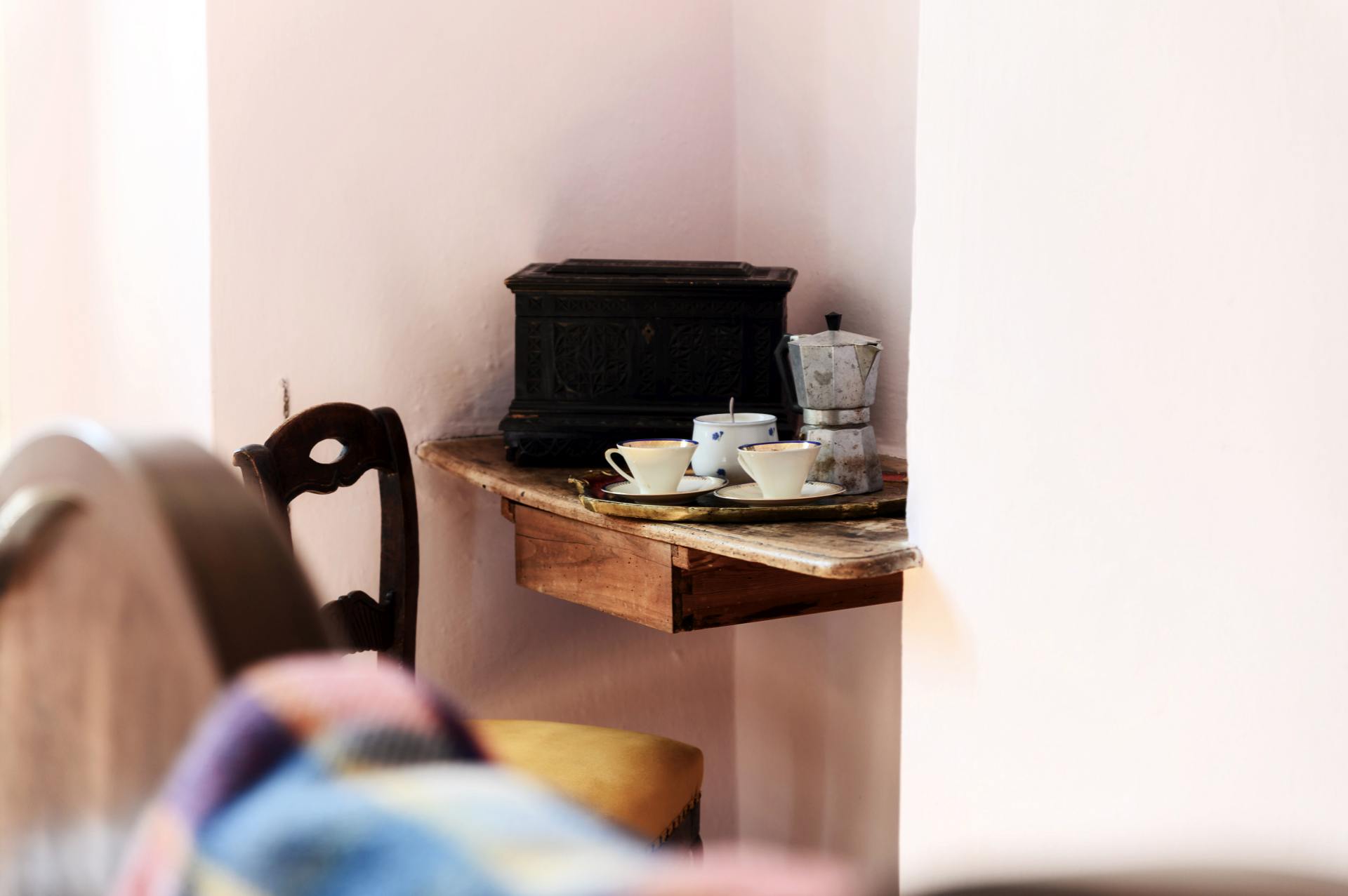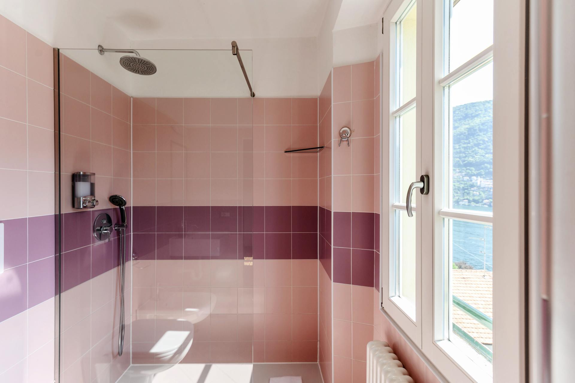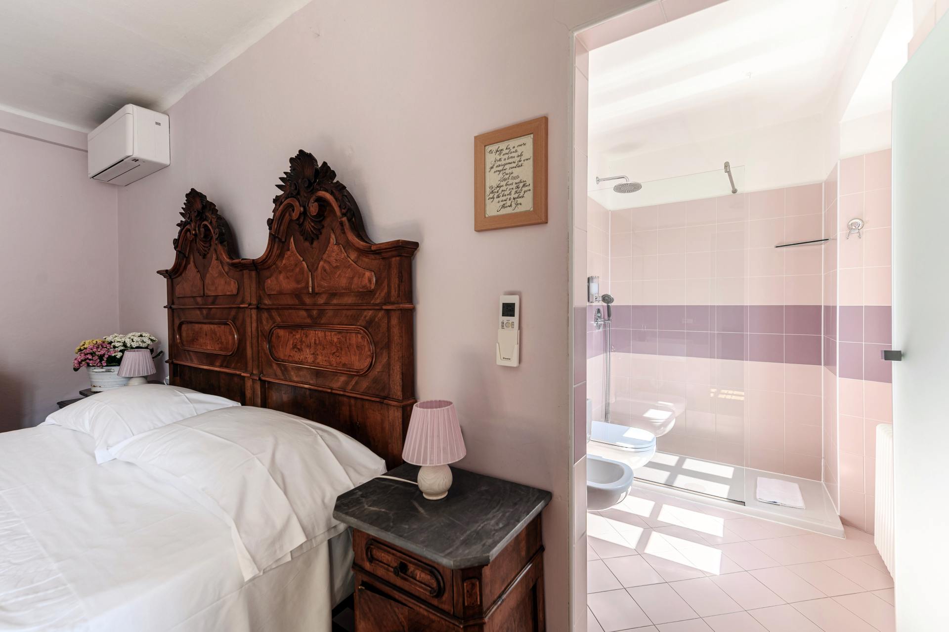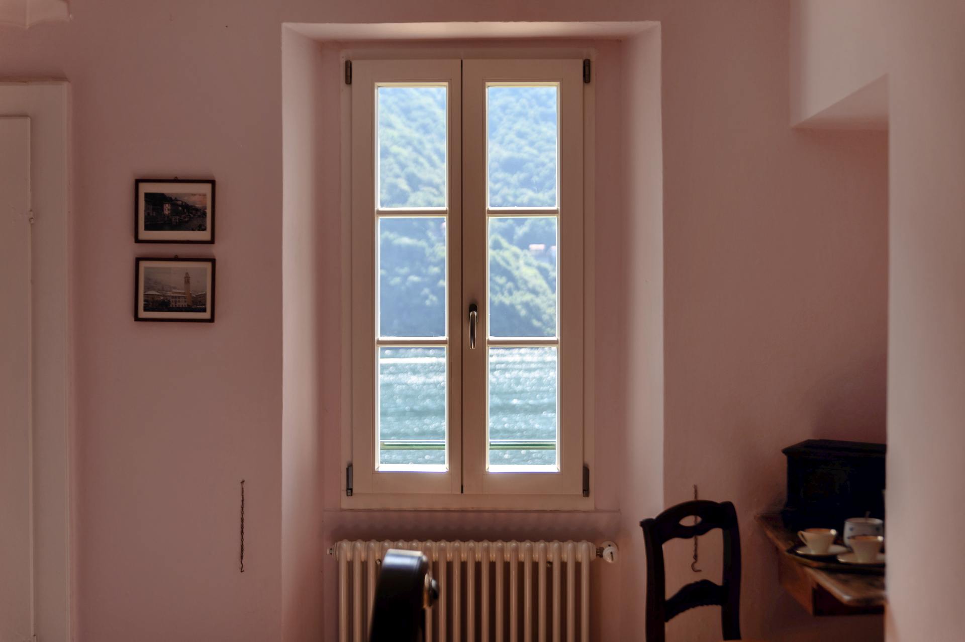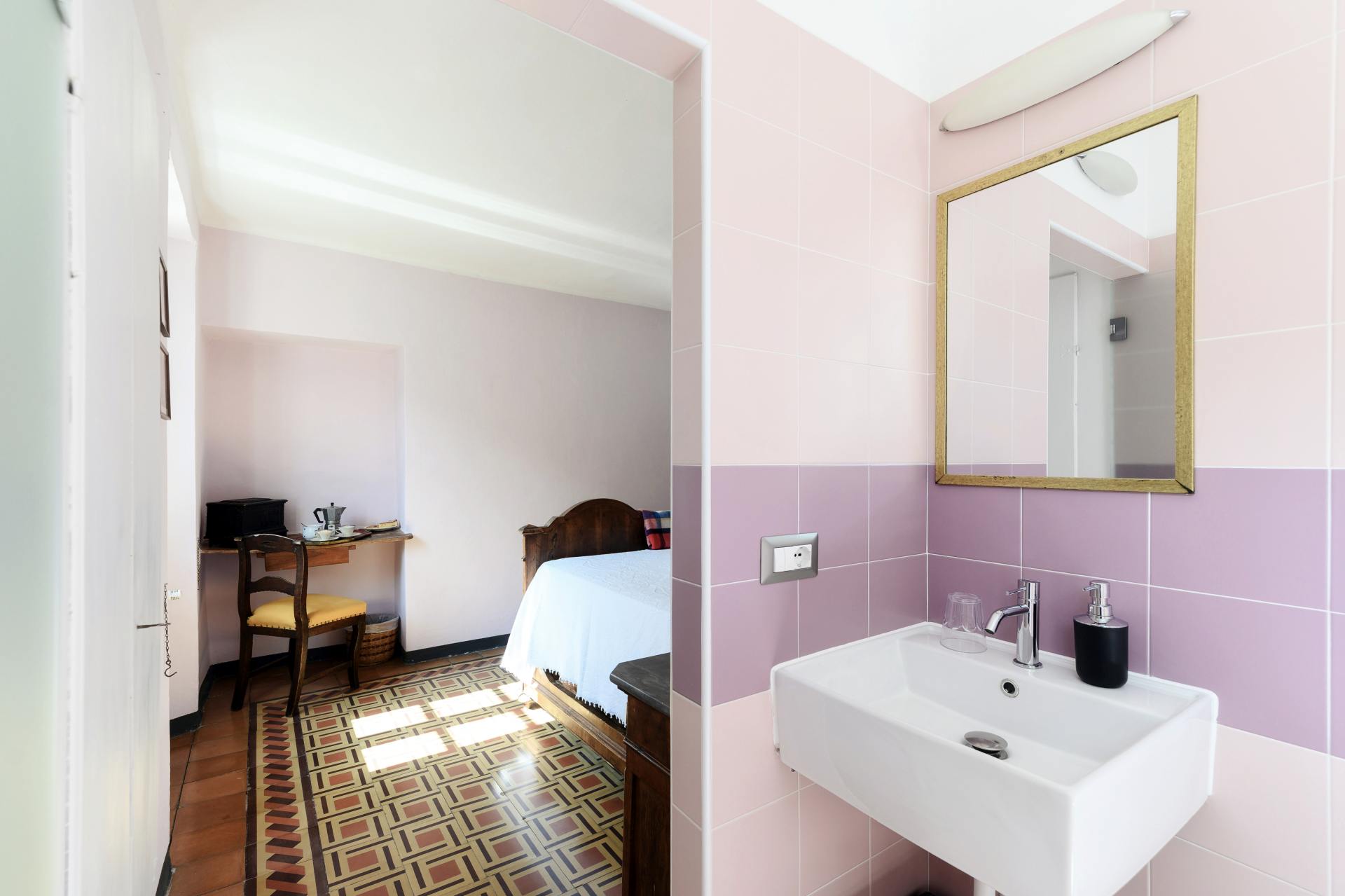 The pastel pink colors, the old wooden bed and the original tiled floor… a little gem overlooking the lake.